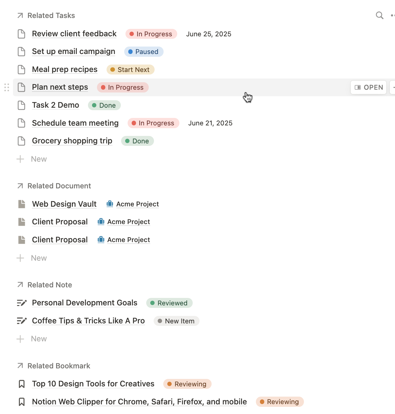 You can even search all related to-dos, documents, notes, and bookmarks inside the project. That’s how my template connects everything in one place—so you can focus on getting things done, not wasting time searching.