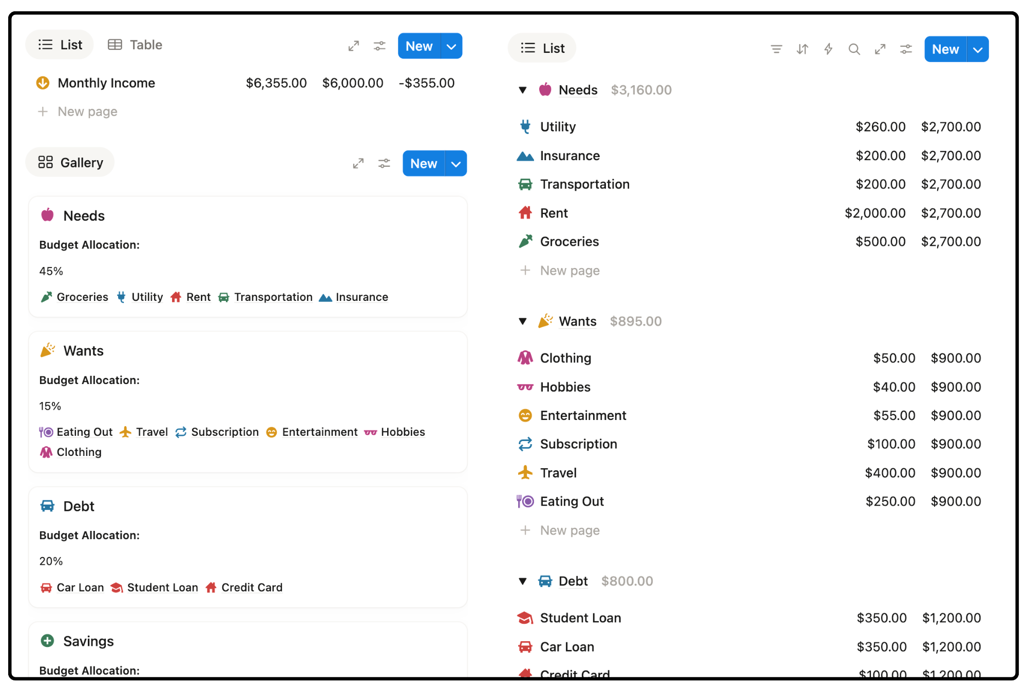 This Notion budget template helps you allocate your income across main categories — Needs, Wants, Savings, Debt, and Investments. Each category can be broken down into detailed subcategories for precise tracking, such as:
